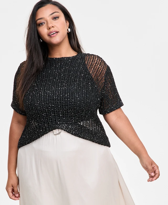 Bar Iii Trendy Plus Crochet Short-Sleeve Sweater, Exclusively at Macy's