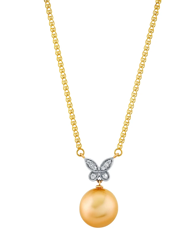Baroque Cultured Golden South Sea Pearl (11mm) & Diamond Accent Butterfly 16" Pendant Necklace in 14k Yellow Gold