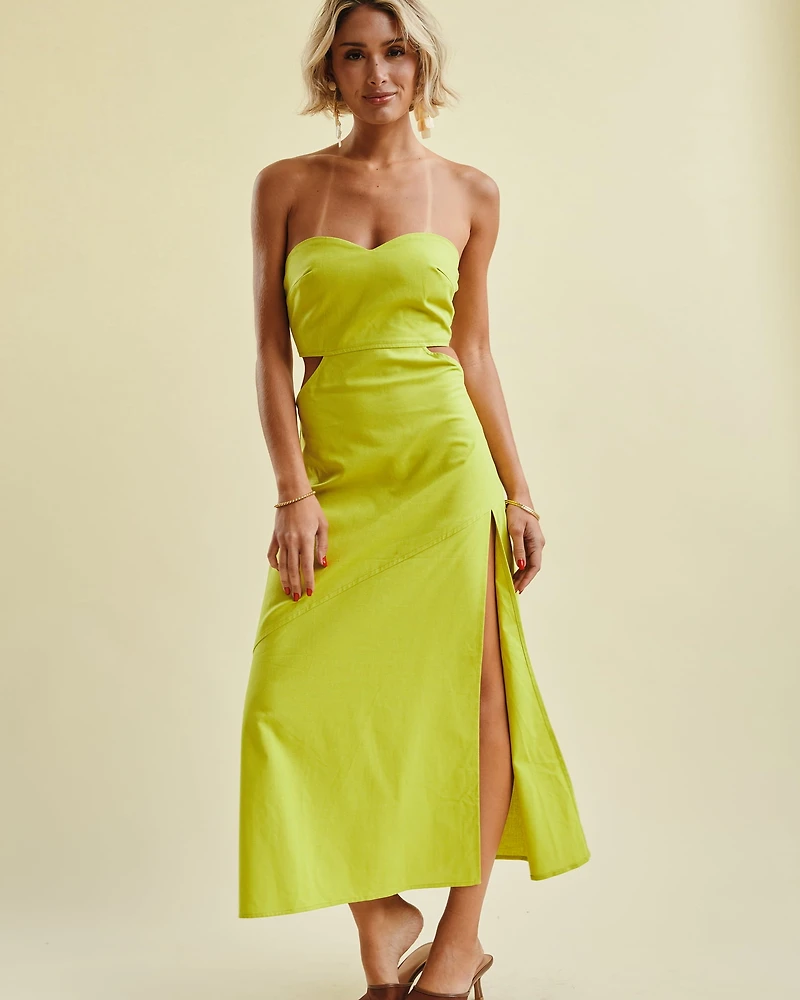 Turn heads in this stunning maxi dress, featuring a chic strapless neckline and daring side cut-outs that perfectly accentuate your silhouette. With its elegant thigh-high slit and crisp, breezy fabric, it’s the ultimate statement piece for a sun-drenched garden party or a glamorous seaside dinner.