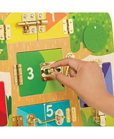 Ages 3 years and up. Facilitate exciting discovery and fine-motor development with this Wooden Lock and Latch Board. The board includes 5 hidden pictures of animals that children must uncover by unlocking or unlatching the doors. Each door has a number that is the same as the number of animals hidden behind it to encourage number recognition skills as they meet their new animal friends. Includes a matching storybook.