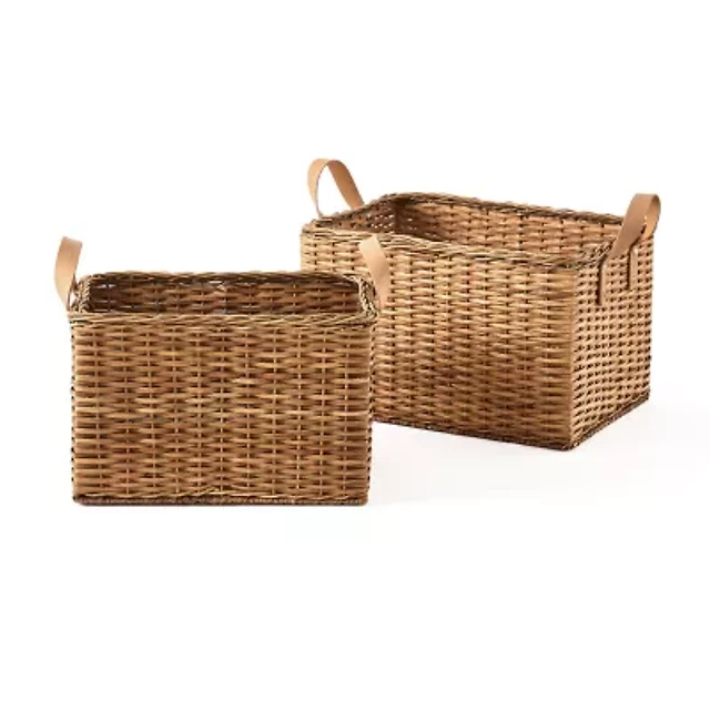 Baum Rattan Rectangular Decorative Basket with Faux Leather Handles