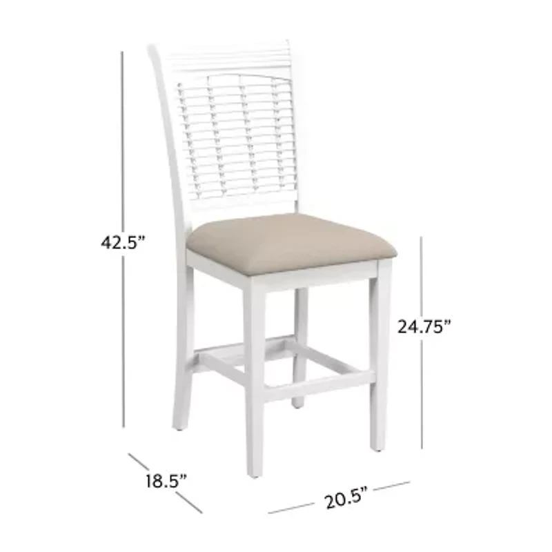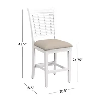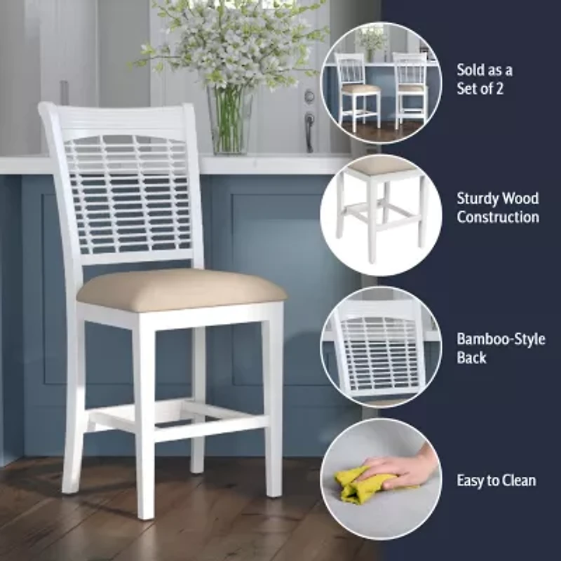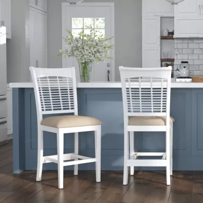 This set of two farmhouse stationary counter height stools features a rattan-inspired lattice back framed by solid wood. The intricate pattern is delicate and earthy, but when paired with the strong lines of the silhouette, the overall effect has an everyday appeal. Featuring an arched apex, the lattice inlay sits directly beneath the slightly curved top rail. The classic white finish further adds to its nostalgic charm, and the plush square seat upholstered in a light beige fabric completes the picture of casual comfort. This stool brings airy sophistication to your kitchen or dining area. Assembly required.
