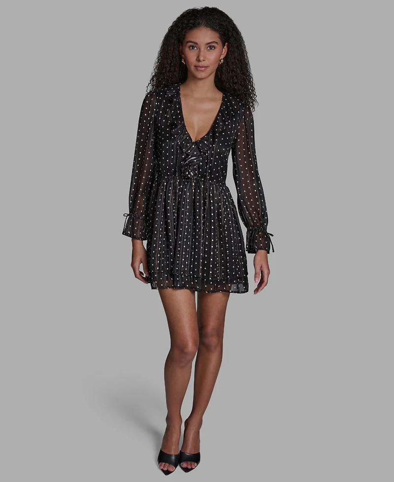 Unveil a playful and elegant style in this Bcbg mini dress, featuring a V-neck and dot ruffle detail. The faux bow closing create a sophisticated look for holiday parties.
