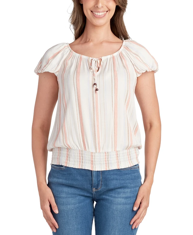 Bcx Juniors' Striped Bubble-Sleeve Pesant Top