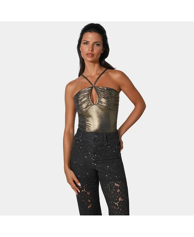 Bebe Women's Puff Sleeve Coated Ruched Top