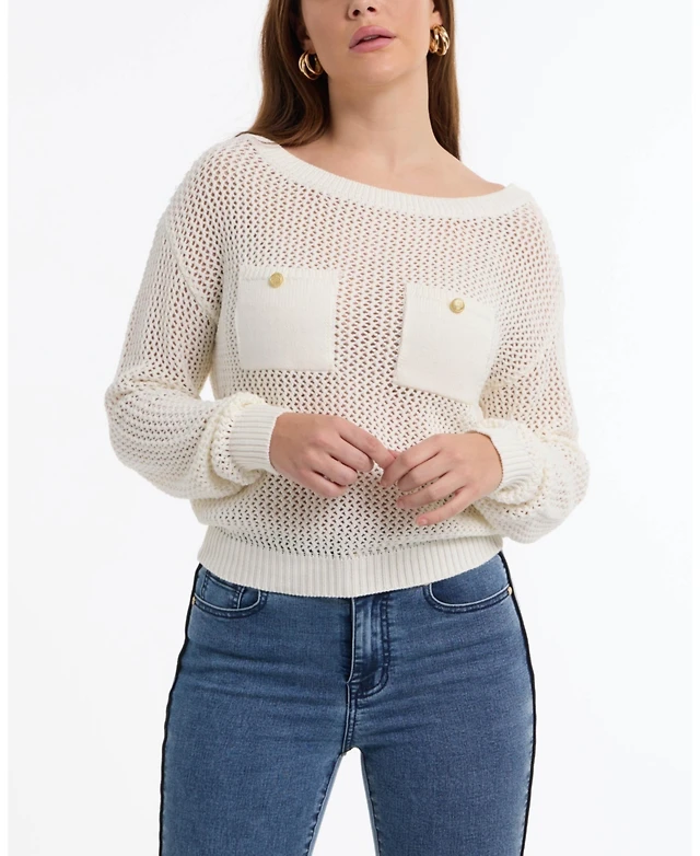 Bebe Women's Off Shoulder Bateau Snapped Slit Sweater