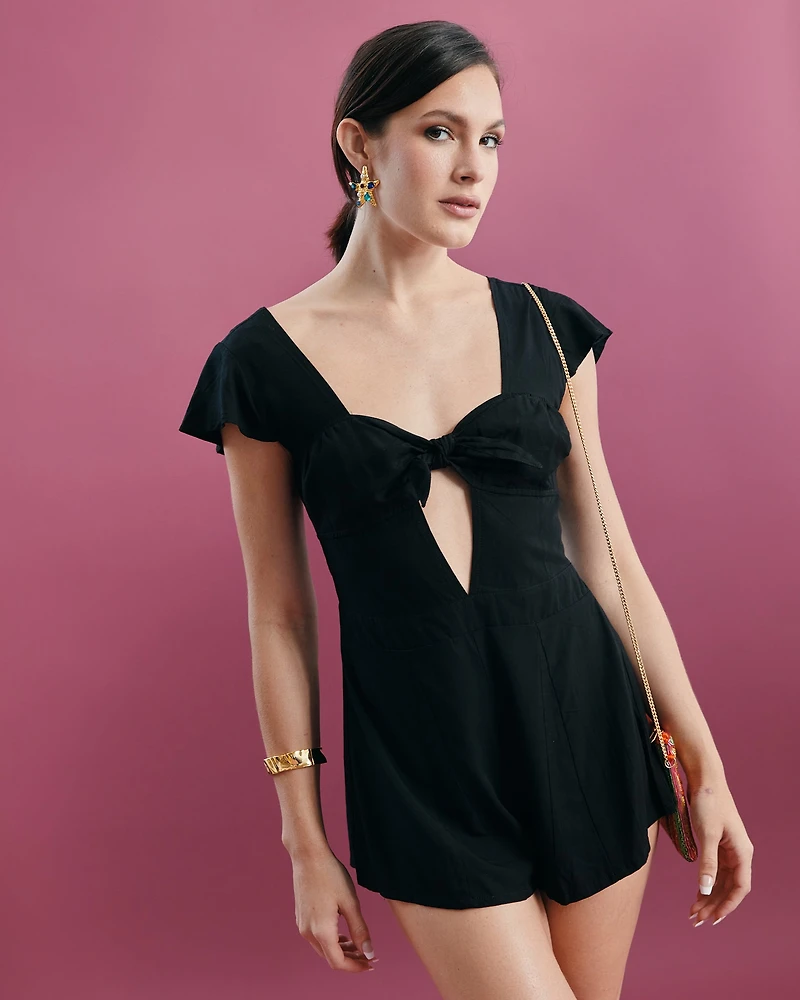 This sexy one-piece jumpsuit brings all the charm with its flirty front tie and stylish cutout that instantly elevates your look. Finished with breezy sleeves and a comfy smocked back, it’s the effortless outfit you’ll reach for when you want to feel cute and confident.