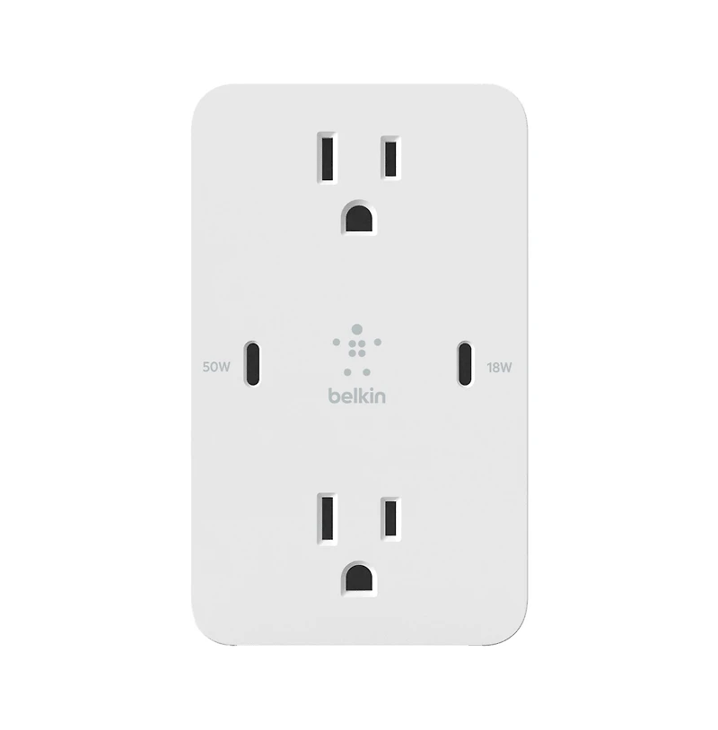 Belkin's GaN Wall Plate offers a convenient and space-saving solution to add two high-power charging ports to your wall outlet. You ll charge your Usb-c devices while keeping two Ac outlets to plug in a printer and monitor in a home office or kitchen appliances, lamps, or a Tv throughout the rest of the house. Equipped with GaN technology, this wall plate enables 68W for high-power charging of larger devices in a convenient size
