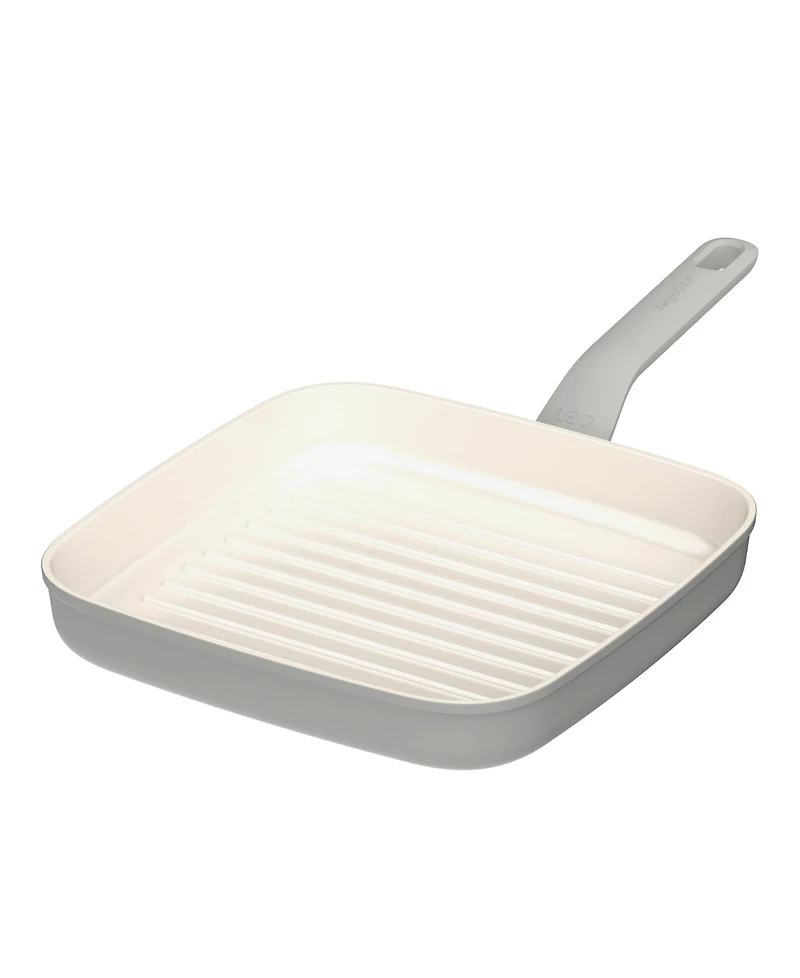 Leo Balance square grill pan 10� is built with sustainable and healthy non-toxic, Ptfe free, Pfas free non-stick CeraGreen ceramic coating, recycled aluminum and stay-cool handle for no oil, no fat cooking, suitable for all types of stoves. Whether you are in the mood for a delicious steak, grilled asparagus, or a piece of salmon, with this 100% recycled Aluminum grill pan you have all you need to grill your food to perfection on any kind of stovetop, including induction. The raised grill lines gives your food those typical grill marks and allow fat and moisture to escape for an extra crispy result. Its aluminum body and flat disk bottom ensure fast and even heat distribution. The non-stick coating provides easy food release as well as a quick clean-up and a stay-cool handle for a comfortable and safe grip. Available in 2 colors: Moonmist and Sage.