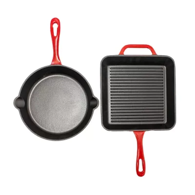 Neo enameled cast iron 2pc fry pan and grill pan set is a kitchen staple that every ambitious home chef should have handy. Grill your heart out with one of these pans - they're great for creating strong, even heat and they season as you use them. Use the 11" grill pan to create homemade paninis, meaty steaks with the perfect grill marks, and chicken breasts grilled to perfection. The helper handle additional feature to these pans for extra mobility when transferring your hot meals from stovetop to oven or to serving dish. Use the fry pan to make succulent lamb chops, crispy bacon, and even a delicious cake. Fry pan has an integrated pour spout which allows you to easily drain any unwanted fat from the pan. Cast iron has great heat retaining abilities and can be used on any heat source. Suitable for all kinds of heat sources, including induction, electric, gas, halogen, and vitro-ceramic. Oven safe up to 535 degree f. Classic in a modern design, solid material for all your cooking needs. Package includes: 10" frying pan, 10" grill pan. Package includes: 10" frying pan, 10" grill pan. Upgrade your kitchen essentials with our cast iron cookware set, crafted from high-quality and durable cast iron material and features an enamel coating and glossy base. The enamel coating is a layer that is non-porous and non-absorbent which makes the surface smooth and hygienic, ensuring cleanup is fast and easy. This fry pan is equipped with a helper handle to easily maneuver the pan and transfer it from stovetop to oven or serving dish. The two pour spouts on each side of the pan make it incredibly convenient to drain excess liquids or pour out sauces. Whether you're draining excess oil or pouring out a sauce, these pour spouts provide precise control and ease of use. The grill pan is also equipped with a helper handle and two pour spouts for added convenience and safety. The square shape provides ample cooking space to grill multiple items while its ridged grill lines enhance the presentation of your food and help to drain excess fat, making your meals healthier. Suitable for all kinds of heat sources, including induction, electric, gas, halogen, and vitro-ceramic. Its cast iron construction ensures even heat distribution and retention for energy efficient cooking. The even heat distribution enhances the flavor and texture of your food, allowing you to achieve delicious and perfectly cooked results every time. Oven safe up to 535 degree f.keep your cast iron cookware set in great condition by allowing it to cool before washing with warm water and mild soap. Make sure to use a sponge or nylon scrubbing pad to remove any stains or food residue and avoid abrasive materials or harsh detergents. Hand wash only.