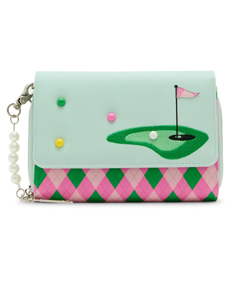 Hit a hole in one with this bag. This bag can be carried a clutch, worn as a crossbody, or used as a wallet. It features a removable chain strap, card slots, and a center zipper compartment.