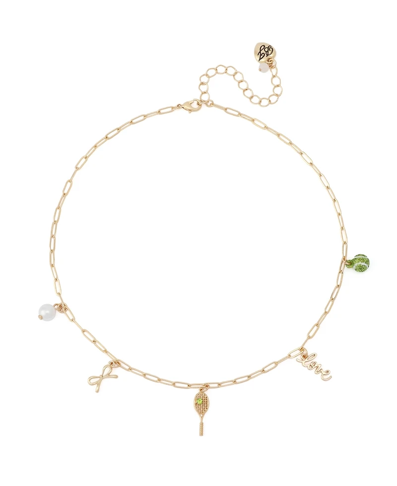 Refined chain bib necklace featuring tennis inspired charms at front. Playful charms include tennis racket, tennis ball, love, bow and delicate Mother of Pearl to complete the look.