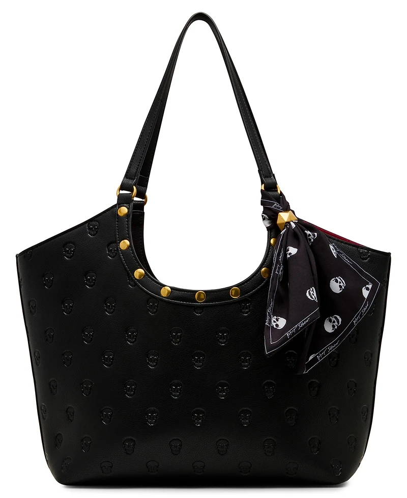 This Betsey Johnson Get Ahead Tote brings edgy glamour to everyday style. Featuring embossed skull detailing, stud accents, and a playful scarf charm, it delivers signature attitude in a polished silhouette. Spacious yet eye-catching, it's the perfect carryall for adding a little rebel energy to any look