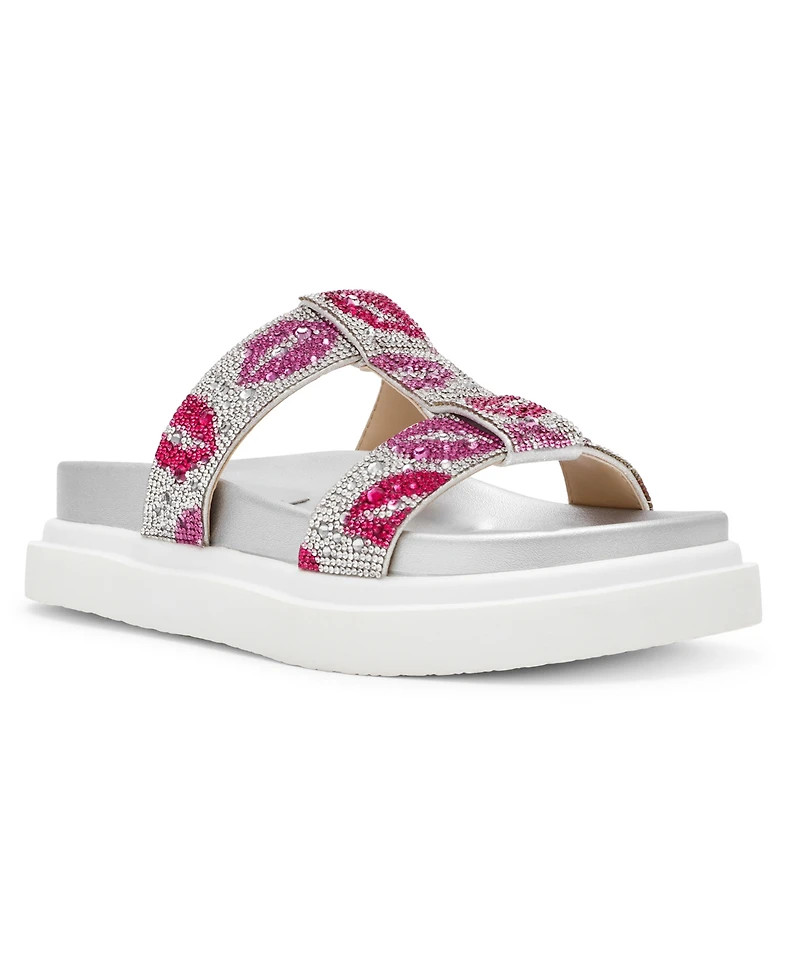 Playful red and pink lip motifs sparkle across the straps of these Betsey Johnson Billy platform sandals. A cushioned footbed and slip-on design combine whimsical style with casual comfort.