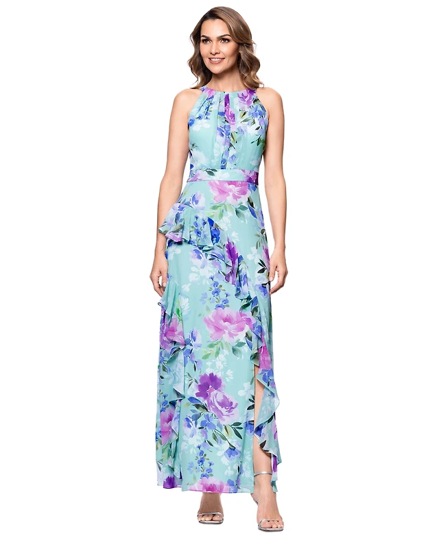 Betsy & Adam Women's Floral Print Ruffled Sleeveless Gown