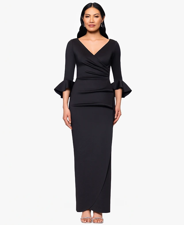 Betsy & Adam Petite V-Neck Long-Sleeve A-Line Gown