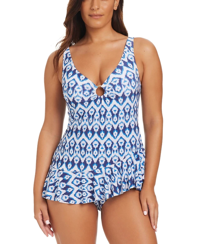 Beyond Control Women's Fine Ikat Ring Ruffle Swim Dress