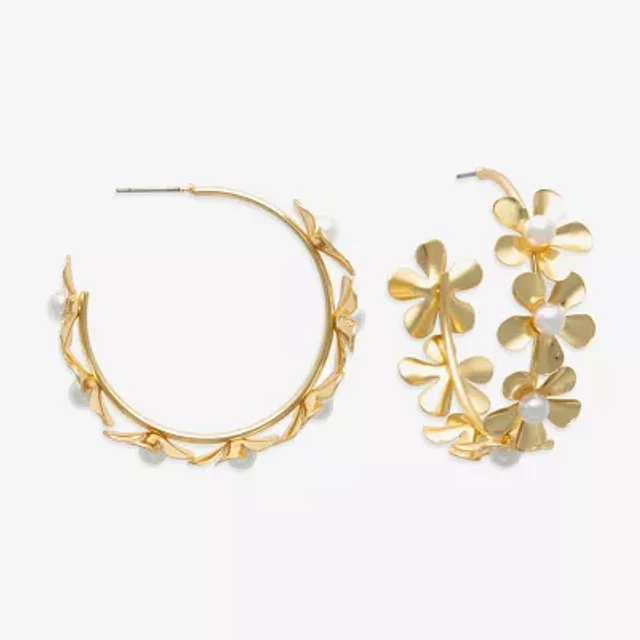 Bijoux Bar Gold Tone Womens Simulated Pearl 47.1mm Flower Hoop Earrings