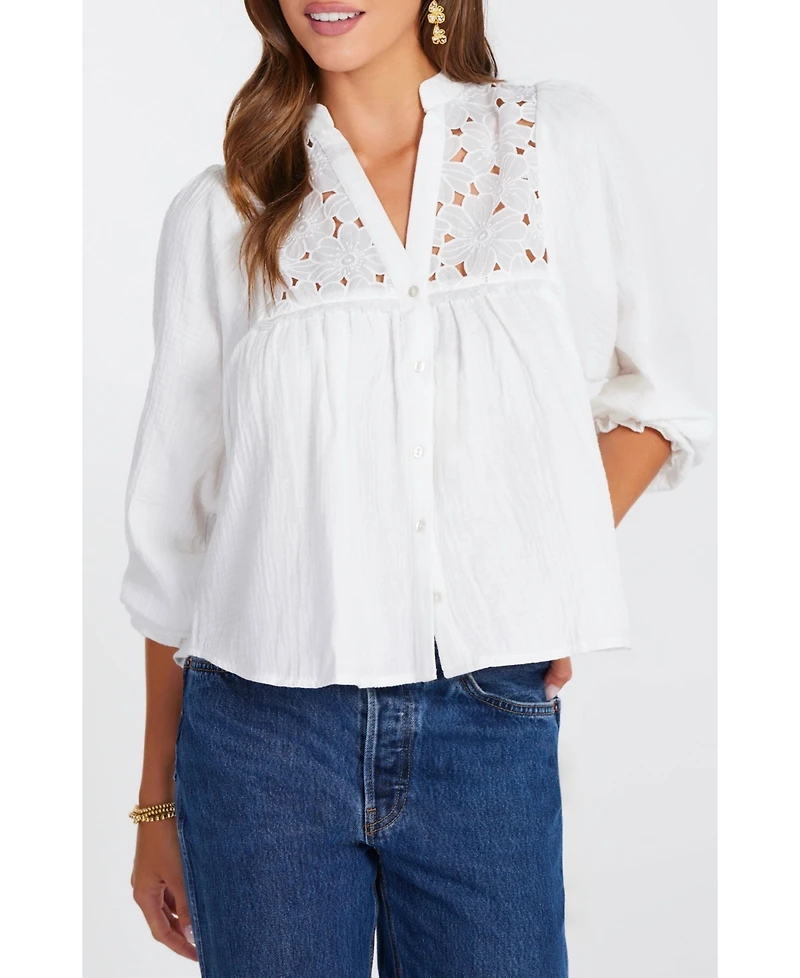 An effortlessly feminine blouse, this airy white top features delicate lace paneling at the yoke with a softly gathered silhouette for an elevated everyday feel. Lightweight and breathable, it balances romance with ease for all-day wear. Style it with vintage denim and sandals for casual polish, or tuck it into tailored trousers for a refined, modern look.