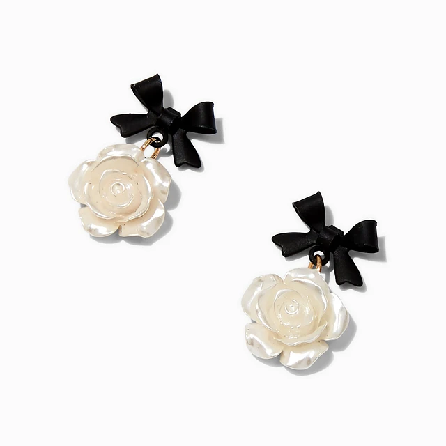 Black Bow Ivory Carved Rose Stud Earrings