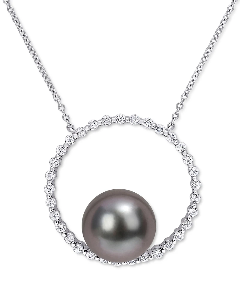 Black Cultured Tahitian Pearl (9-1/2mm) Circle 17" Pendant Necklace in 10k White Gold