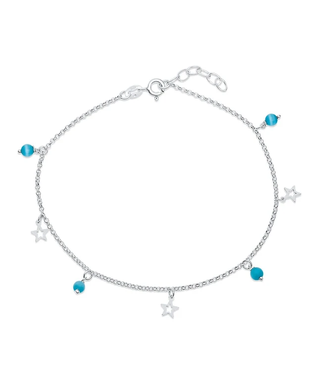 Bling Jewelry Dangle Aqua Blue Vacation Cats Eye Bead Anklet Open Star Multi Charm Ankle Bracelet .925 Sterling Silver Adjustable