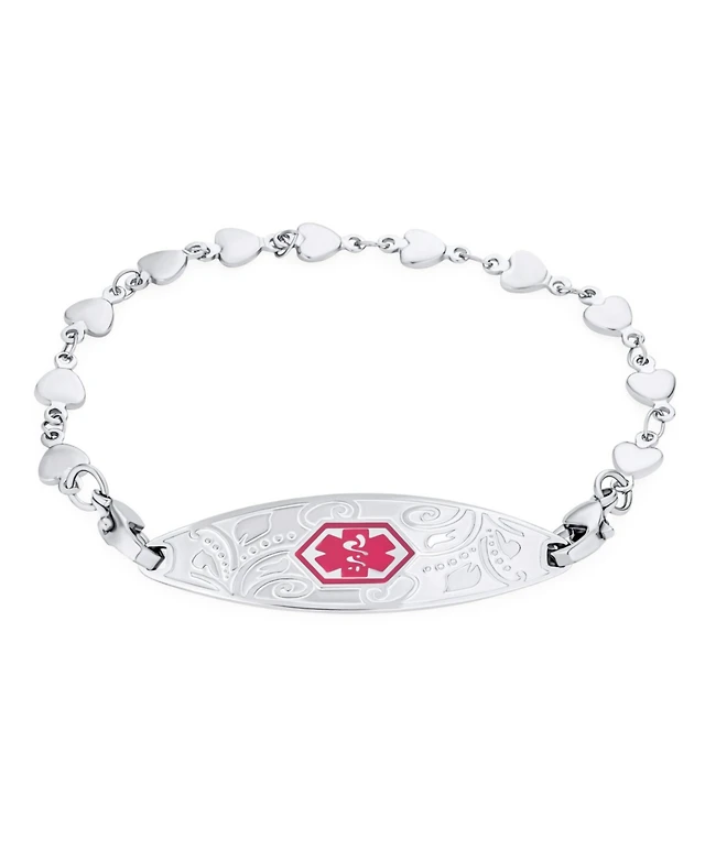 Bling Jewelry Feminine Antique Style Floral Leaf Medical Id Bracelet Pink Heart Link Chain 7.5"