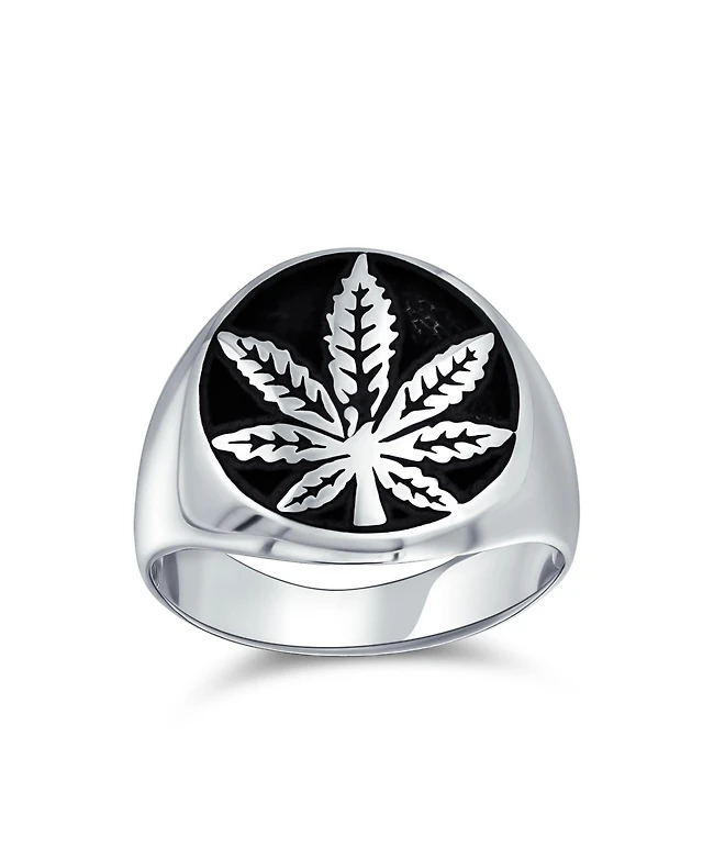 Bling Jewelry Mens Statement Black Marijuana Leaf Medallion Round Signet Ring Sterling Silver
