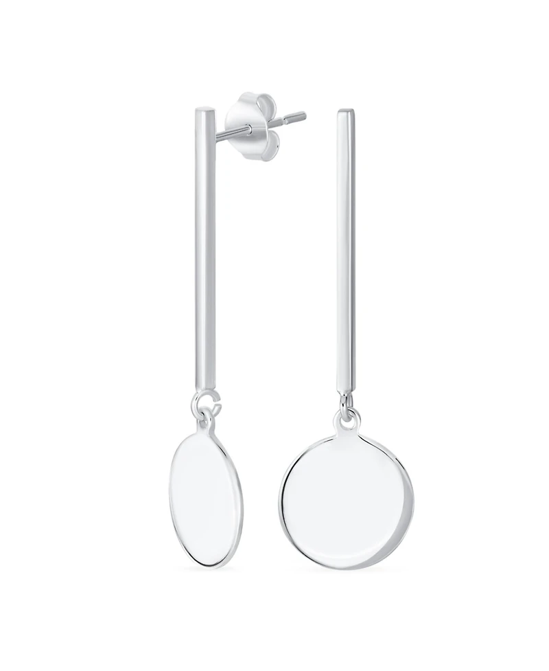 For an mod retro look exuding elegance, you will love these ultra modern earrings. A flat round circular disc with a high polished finish dangles from a shimmering silver bar to add simplistic style to your ensemble and frame your face with flattering angles.
