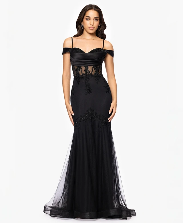 Blondie Nites Juniors' Glitter-Mesh Illusion-Corset Gown