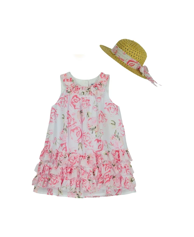 Blueberi Boulevard Baby Girls Ruffle Trim Floral Tent Dress Straw Hat Set