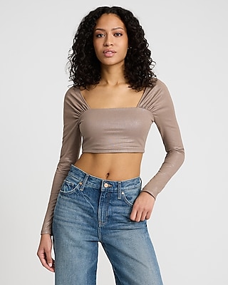 Body Contour Stretch Cotton Shine Ruched Shoulder Cropped Tee