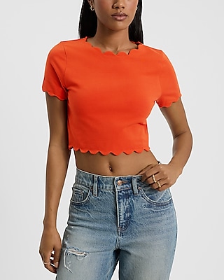 Body Contour Stretch Cotton Scalloped Cropped Short Sleeve Tee