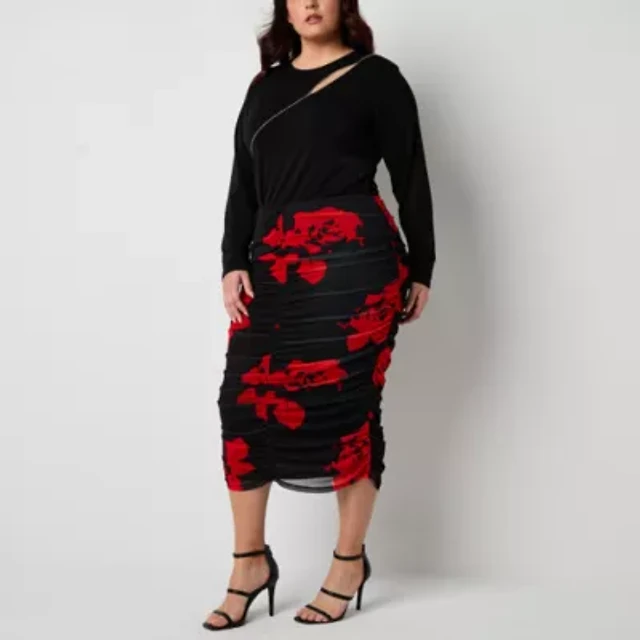 24seven Comfort Apparel Plus Black Multi Floral Print Midi Pencil Skirt