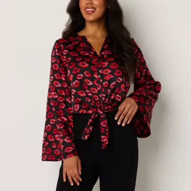 Bold Elements Womens Split Tie Neck Long Sleeve Satin Blouse