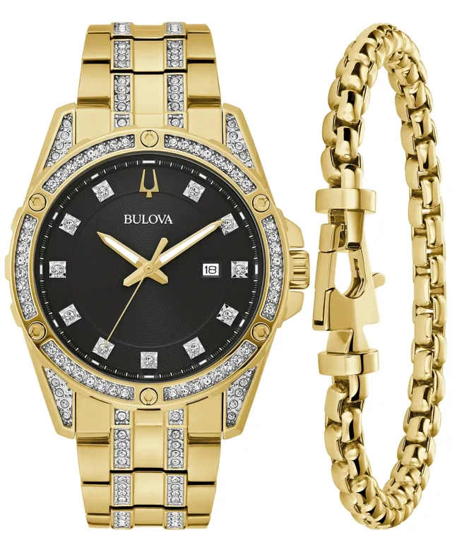 Bulova Men's Classic Crystal Gold-Tone Stainless Steel Bracelet Watch Box Set 43mm