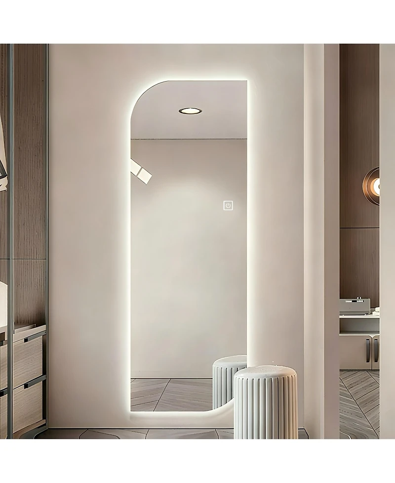 This full-length mirror features a modern irregular shape that adds a stylish, contemporary touch to any space. The integrated touch controls allow easy adjustment of three color temperatures-3000K warm, 4000K neutral, and 6000K white-with smooth stepless dimming from 0% to 100% for grooming, styling, or ambient lighting. Made with 5mm copper-free silver glass, it delivers a clear, distortion-free reflection while resisting oxidation and corrosion. The shatter-resistant, moisture-proof backing enhances safety and durability. Wall-mounted installation is simple with included hanging plates, mounting kit, and 3M adhesive strips. Supports hardwired or plug-in power options. Perfect for bedrooms, entryways, dressing rooms, walk-in closets, and professional salons.