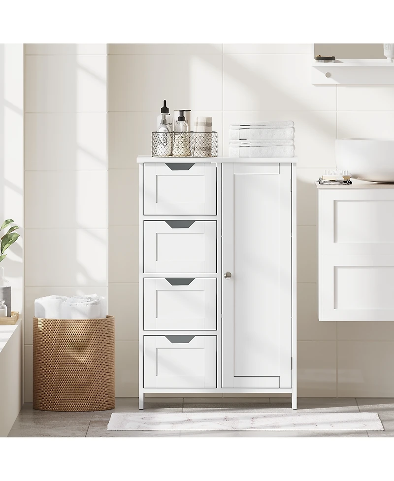 This freestanding bathroom storage cabinet features a durable Mdf construction with a smooth, moisture-resistant white finish that is easy to clean. Its modern design with simple lines complements a variety of interiors, including contemporary and minimalist styles. The cabinet offers versatile storage with four drawers and one enclosed cupboard, plus an adjustable interior shelf to accommodate items of different sizes. It keeps toiletries, towels, and household essentials organized and neatly out of sight. Compact yet functional, it fits in bathrooms, entryways, bedrooms, or other small spaces. An included anti-tip kit allows secure wall anchoring for added safety, making it practical for everyday use in homes with children or pets.