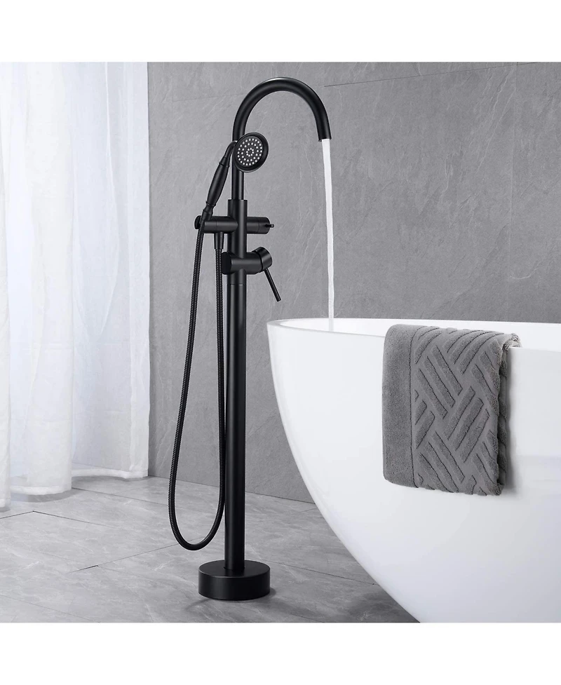 This matte black floor-mount freestanding tub filler combines modern style and reliable performance. It features a 360degree(s) high-arc gooseneck spout for easy tub filling, with solid brass construction for durability.The single lever handle provides precise control over water flow and temperature, while a diverter knob switches water to the handheld shower. Equipped with a 59"" hose, the hand shower offers great flexibility for rinsing, cleaning, and bathing kids or pets.Sleek and functional, this faucet is an excellent choice for modern bathrooms.