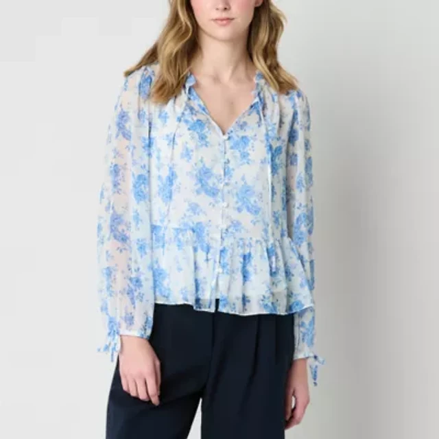 by&by Womens Juniors Split Tie Neck Long Sleeve Peasant Top