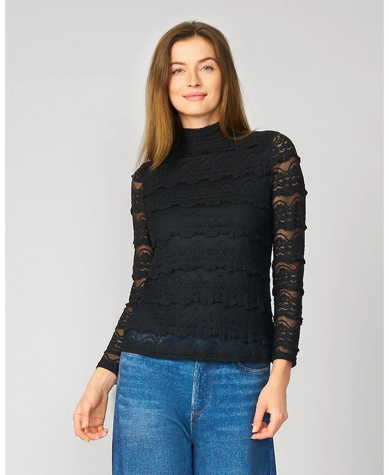 Cable & Gauge Women's Ruffle Lace Stretch Mock Neck Top