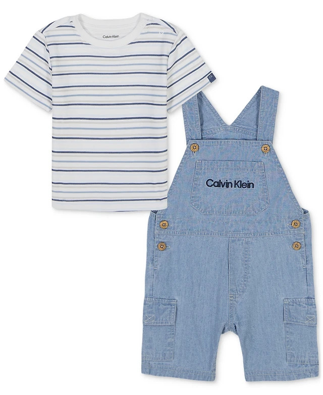 Calvin Klein Baby 2-Pc. Set Striped T-Shirt & Denim Cargo Shortall
