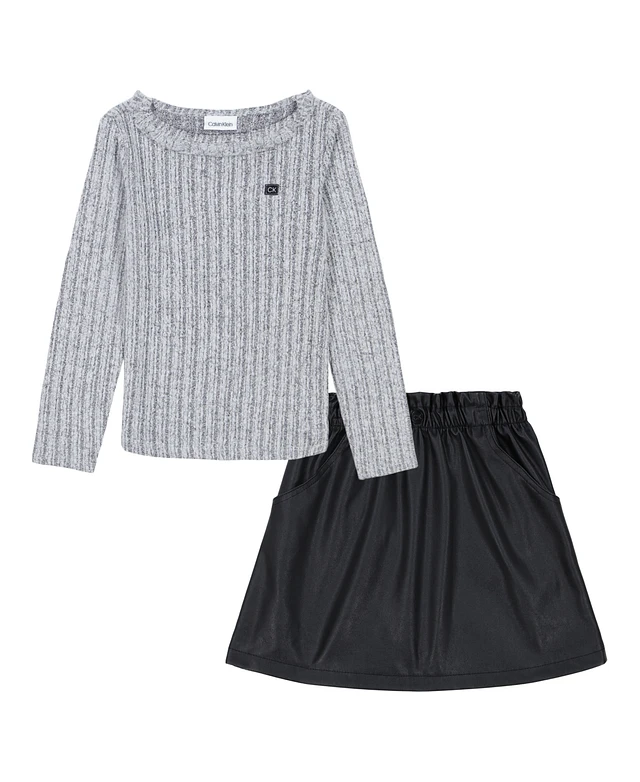 Calvin Klein Toddler and Little Girls Ruffle Collar Ribbed Top Paper-bag Waist Artificial Leather, 2-Piece Skirt