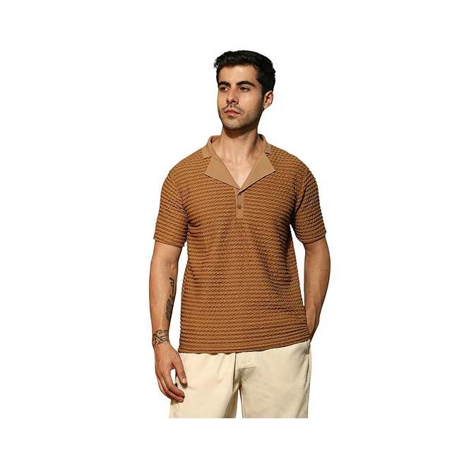 Campus Sutra Men's Coffee Brown Crease-Tactile Cuban Polo T-Shirt