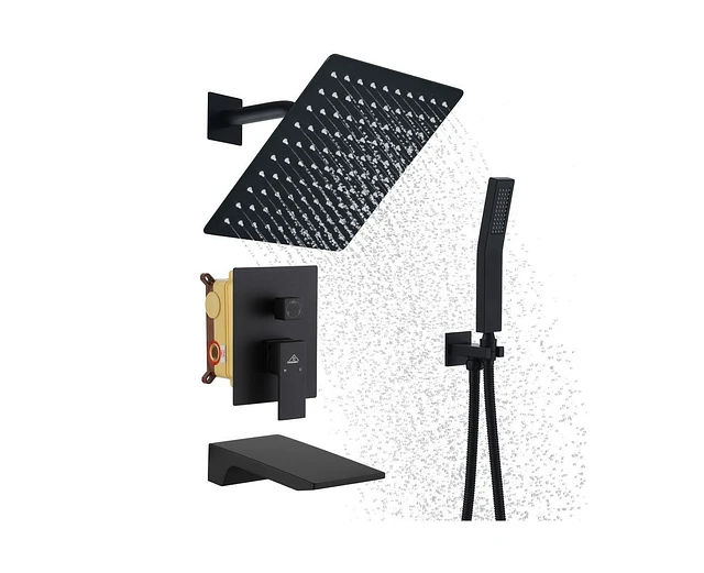 Rainsken Male Npt Waterfall Tub and Shower Faucet Set, 10-Inch Matte Black Rain Shower System, Black
