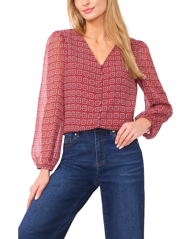 Refined and flattering, this CeCe blouse features a V-neck and long sleeves with elastic cuffs for a relaxed, stylish fit. Center front buttons complete the look with subtle sophistication. About The Brand: CeCe is a contemporary lifestyle brand inspired by a romantic take on the everyday, punctuated by taste, wit, and on-the-go flair.