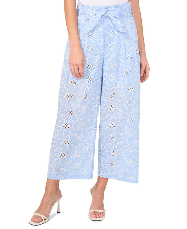 CeCe Women's Floral-Embroidered Tie-Waist Wide-Leg Pants