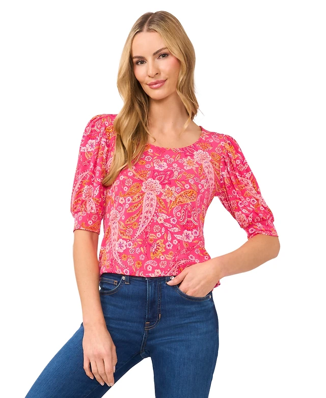 CeCe Women's Paisley-Print Shirred Scoop-Neck 3/4-Sleeve Knit Top