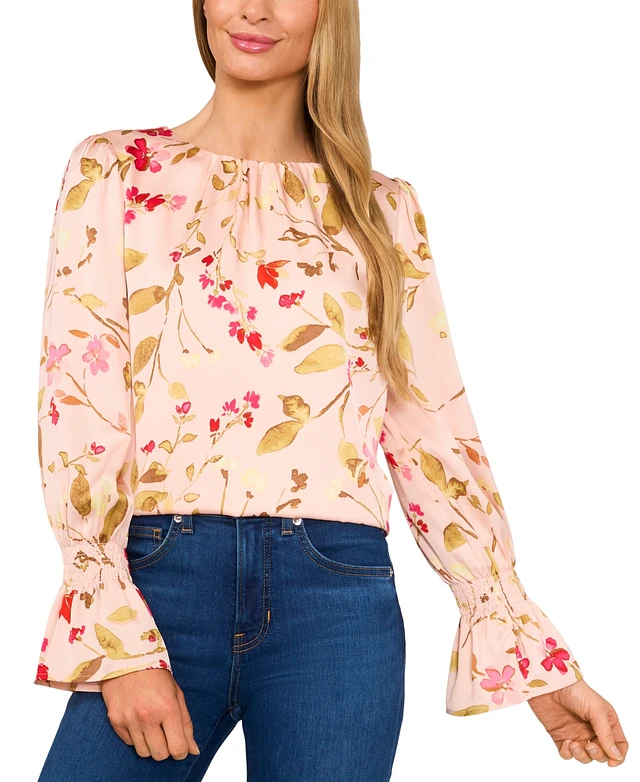 CeCe Women's Printed Long-Sleeve Smocked-Cuff Blouse