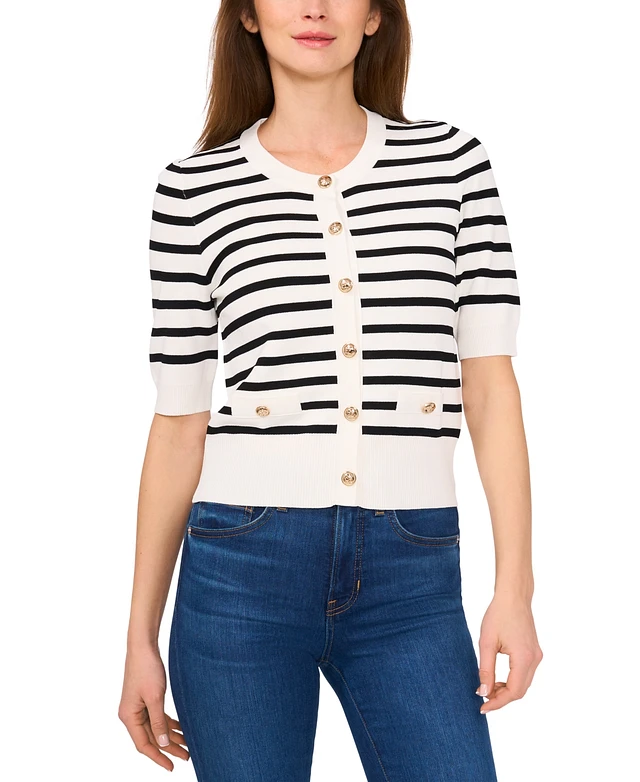CeCe Women's Cotton Contrast-Stripe Short-Sleeve Sweater